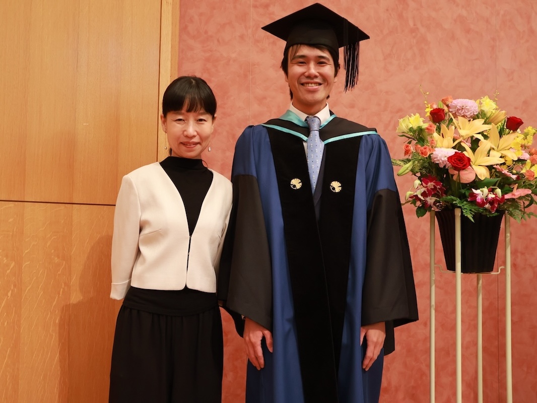 2025/9/19 With my supervisor, Professor Miyazawa, at the doctoral degree conferment ceremony.